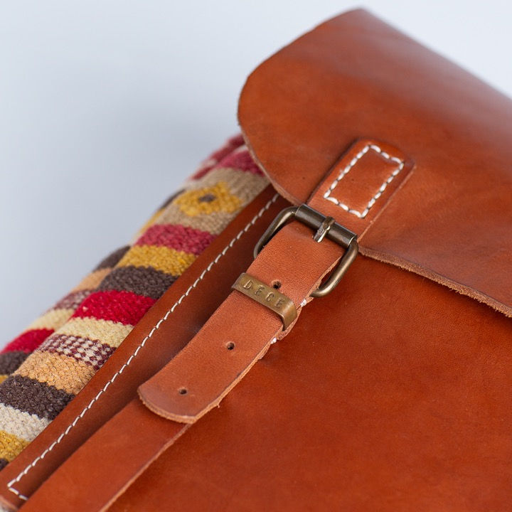 The Carpet Backpack completes our limited edition range. Echoing the shape and structure of out Explorer leather backpack this patterned bag adds a little fun to any adventure. Its structured satchel-style design makes it stylish for any occasion. This bag boasts contrasting leather straps and back and front pocket, cut and worked by hand and adjustable shoulder straps and a double buckle closure hand-made by our leather craftsmen.