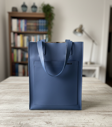 This is a practical, spacious but trendy shopping bag with a zip closing and interior hanging pockets, one of which is zipped and the other open.
